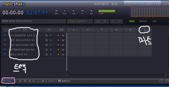 분홍색똥그라미 <메뉴>를 클릭하여 트랙, 파트를 설정할수있다